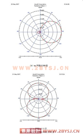 1. 使用HFSS软件对对数周期天线建模仿真,得出400MHz和800MHz时天线的辐射方向图。