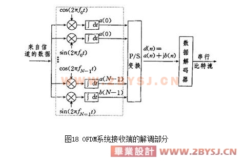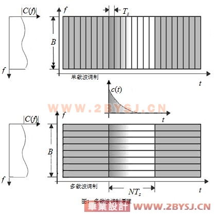 OFDM是一种多载波调制(MSC)技术,它将串行高速信息数据流变换成为若干路并行低速数据流,每路低速数据被调制在彼此正交的子载波上,然后所有子载波叠加在一起构成发送信号。和传统的单载波系统相比,OFDM系统的各子载波信道频谱相互重叠,因此具有较高的频谱利用率,其频谱效率比单载波高出近一倍。同时,OFDM 通过串X 并转换,使高速数据流变成多个在子载波上并行传输的低速数据流,减小了无线信道对系统的影响,增强了抗多径和频率选择性衰落的能力。此外,OFDM 的正交子载波将频率选择性衰落信道等效为若干并行的平坦衰落信道,将信道的影响等效为复数因子, 简化了信道均衡。而且,OFDM还可以通过动态功率分配技术和比特自适应调制技术使系统达到最优性能。因此,OFDM作为一种高效传输技术深受关注,并陆续成为多个标准的关键技术,如数字音频广播DAB、数字视频广播DVB、无线局域网、数字电视DTV 以及第四代移动通信等。