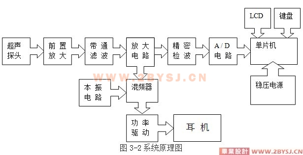 In through to the supersonic wave archery target research in, we discovered the ultrasonic wave is one kind of high frequency short wave, and it disseminates in the air has the very strong directivity. Based on this characteristic, I have designed a set of ultrasonic waves examinations electric circuit, this electric circuit has included the analogous circuit and the digital circuit, analogous circuit has contained the signal enlargement electric circuit and the audio frequency processing electric circuit; The digital circuit by auxiliary equipment and so on the monolithic integrated circuit and LCD, keyboard is composed. In to the ultrasonic wave signal processing process in, the signal after enlarges after the filter, a group gives monolithic integrated circuit processing, and on display monitor read signal intensity and speed of flow; Another group through falls the frequency to transform for may listen to the sound, thus realization examination goal.