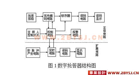数字抢答器就是利用数字电子技术实现的。主要为了实现抢答、定时、报警功能。其电路由主体电路与扩展电路组成。优先编码电路、锁存器、译码电路将参赛队的输入信号在显示器上输出;用控制电路和主持人开关启动报警电路,以上两部分组成主体电路。通过定时电路和译码电路将秒脉冲产生的信号在显示器上输出实现计时功能,构成扩展电路。