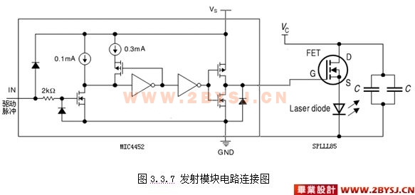 文中对激光测速系统硬件电路中各部分功能进行了详细的叙述,并说明了它们在该硬件电路中的工作原理和性能参数。在激光发射方面,使用半导体激光二极管和高性能驱动芯片产生高质量的光脉冲作为测速信号;在光信号接收方面,使用对特殊波长响应度极高的低噪声的雪崩二极管作为接收器件,利用高带宽放大芯片结合高速比较器提取有用信号。