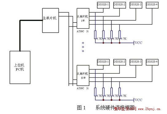 本设计运用主从分布式思想,由一台上位机(PC微型计算机),下位机(单片机)多点温度数据采集,组成两级分布式多点温度测量的巡回检测系统。该系统采用 RS-232串行通讯标准,通过上位机(PC)控制下位机(单片机)进行现场温度采集。温度值既可以送回主控PC进行数据处理,由显示器显示。也可以由下位机单独工作,实时显示当前各点的温度值,对各点进行控制。