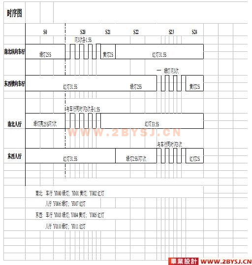 31.5秒。 2)横向车行道交通灯 红灯亮31.5秒 绿灯亮25秒 绿灯闪亮3次各1.5秒 黄灯亮2秒。 3)人行道交通灯 人行道没有黄灯,红灯较车行道红灯增加2秒;让人行道绿灯先闪亮7次,后3次与车行道同时闪亮,随后,车行道绿灯切换为黄灯。应完全能够仿真实际的交通灯控制。