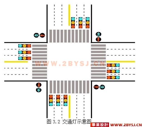 交通灯示意图如图3.2所示,在东西南北两个方向均安装信号灯,两个方向各6个灯,分为三个方向红、黄、绿三种颜色。