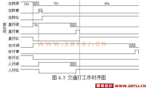 (2)南北向和东西向人行道均设有通行绿灯和禁行红灯。南北人行道通行绿灯应在南北向主干道直行绿灯点亮3S后才允许点亮,然后接3S绿闪,其他时间为红灯;同样,东西人行道通行绿灯于东西向主干道直行绿灯点亮3S后才允许点亮,然后接3S绿闪,其它时间为红灯。