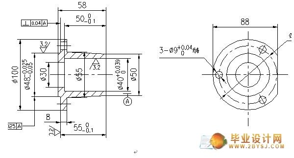 二套之间的相对位置可通过定位实现。利用套上φ48凸台和φ9孔及φ100端面定位,φ9孔装入菱形销, φ48凸台插入定位沉孔,用这样的类似于一面二销的六点完全定位方式保证相对位置,其中一只套定位在压头上,另一只套定位于固定支座上。