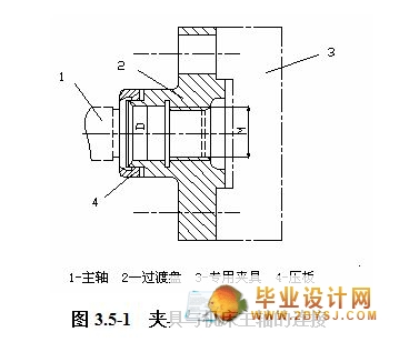 由于本工序在C620车床上进行,过渡盘以内孔在主轴前端的定心轴颈上定位,用螺纹紧固.过渡盘与主轴前端采用H7/h6配合.所以为了夹具的安装,还需设计一个法兰盘,其连接部位的尺寸与机床主轴的尺寸相配合,可按机床的尺寸进行选取,其余的外形尺寸依据夹具体的大小进行确定。