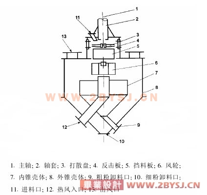 经过打散粉碎后的物料在挡料锥的导向作用下通过挡料锥外围的环形通道进入在风轮周向分布的风力分选区内。物料的分级应用的时惯性原理和空气动力学原理,粗颗粒物料由于其运动惯性大,在通过风力分选区的沉降过程中,运动状态改变较小而落入内锥通体被收集,由粗粉卸料口卸出返回,同配料系统的新鲜物料一起进入辊压机上方的称重仓。细粉由于其运动惯性小,在通风风力分选区的沉降过程中,运动状态改变较大而产生较大的偏移,落入内锥筒体之间被收集,由细粉卸料口卸出送入球磨机继续粉磨或入选粉机直接分选出成品。