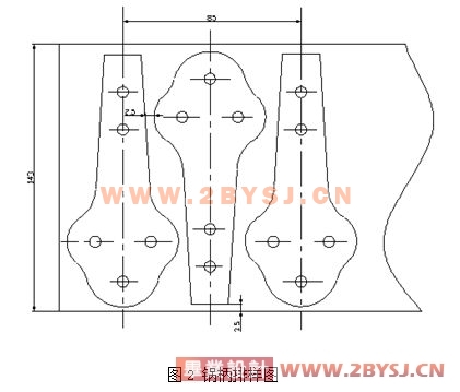 设计级进模,首先要设计条料的排样图。锅柄的形状具有一头大一头小的特点,直排样时材料利用率低,应采用直对排样,如图2所示的排样方法,设计成隔位冲压,可显著地减少废料。隔位冲压就是将第一遍冲压以后的条料水平方向旋转1800,再冲第二遍,在第一次冲裁的间隙中冲裁出第二部分工件。搭边值取2.5mm和3.5mm,条料宽度为143mm步距为96mm,一个步距的材料利用率为63%。查板材标准,宜选1000mmX2550mm的钢板,每张钢板可剪裁为7个条料(143mmX2550mm),每张条料可冲60个工件。