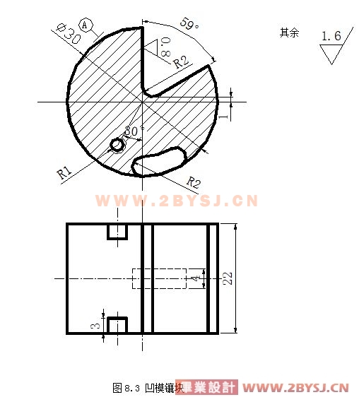 此模具具有一对有缺口的转轴凹模,其缺口与工件外形相适应。凹模是转轴式的,左右两件对称。这种形状的凹模制成组合式的,且镶在凹模镶块中,便于机械加工。另外镶块部分容易磨损,这样利于更换又节省材料。