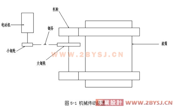 方案三 抛丸器传动:由电动机经链轮传动叶轮主轴使叶轮高速旋转。滚筒传动:由电动机经由齿轮传动带动托轮,再以齿轮传动滚筒。集尘器选用旋风除尘器。