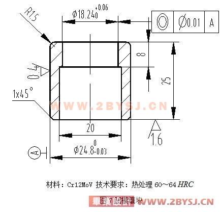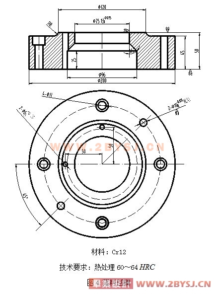 由于这样一个工艺按单工序模具来加工,则需四个工序,即需要四套模具。四台设备,模具制造费用大,生产效率低,且不容易保证尺寸精度,操作不便,也不够安全,所以方案一不合理。若采用模具级进则模具制造难度加大。工件的尺寸也不容易保证。生产效率也不高,所以方案三也不合理。而采用复合模制冲件时,由于这个工件的结构不太复杂而且轴对称,复合模的成本不是太高,制造的难度也不大,容易保证尺寸的精度,操作也方便,安全性好,生产效率高,所以综合考虑,方案二比较合理。