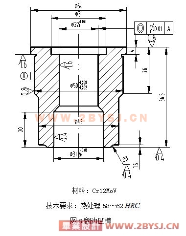 方案三:落料-冲孔-拉深-翻边,采用级进模具,即先冲孔落料再拉深翻边,只需要一套模具。
