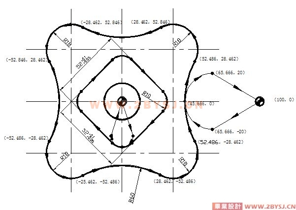 工件外轮廓全是由曲线组成,不便于夹装和定位,所以必须和配合件配合加工,配合时以上表面和中心为定位基准进行加工。