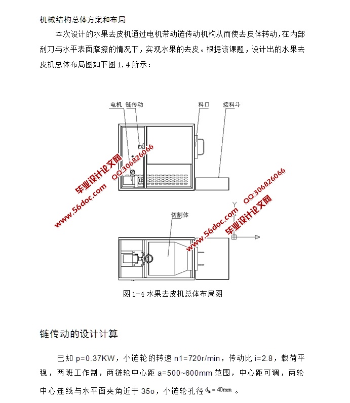 根据课题,我们要设计的水果去皮机,是针对水果的数量很多,并且需要常常变换大小的,我们采用人工放水果进去,当水果放进去水果皮的那个去皮体的时候,就会随着去皮体一起旋转,水果在气割体里面转动,由于去皮体里面有刀片,随着去皮体的旋转,就实现了水果的去皮,人工把水果一下子全部倒入去皮体,电机通过链传动带动去皮体旋转,当旋转到一定的时候,水果皮就会自己去除干净,达到了我们需要的目的。