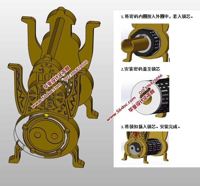 本设计主要针对一种仿古密码锁的结构进行设计,先规划出仿古密码锁的整体方案,然后从这个方案入手,具体细化出具体内部结构,其具体内部结构主要包括以下几个方面: