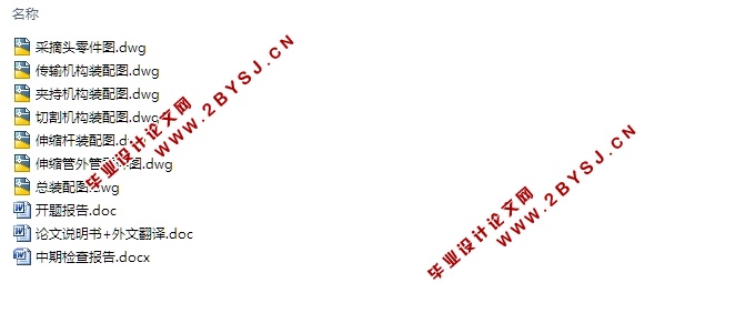 抛开我国的智能化采摘机械设备研究进展程度不说,但就其成本而言,一台成熟的智能采摘设备对于果农而言,它的价格是无法接受的。而市面上常见的一些简易采摘器又无法完全承担起整个采摘任务,减轻果农的劳动强度,希望能够通过本次的毕业设计课题改善这种情况。本次毕业设计的主要内容包括: