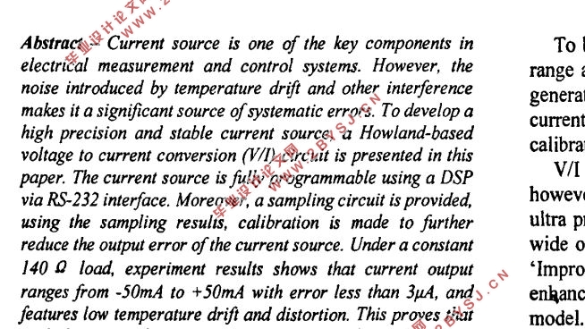 摘要 ——电流源是电气测量和控制系统的关键部件之一。然而,由温度漂移和其它干扰引入的噪声,使其成为系统误差的重要来源。为了制定一个精度高、稳定性好的电流源,本文提出一种基于Howland的电压电流转换(V/I)电路。电流源所使用的DSP RS-232接口是完全可编程的。此外,还有一个采样电路,利用抽样结果,使校准进一步减少电流源输出误差。实验结果表明,在140欧姆的恒定负载下,电流输出范围为-50mA至50mA,误差小于3 μA,并且具有较低的温度漂移和较小波形失真度。这为设计一种精确度高、输出电流变化范围稳定的电流源提供了一种有效的方法。